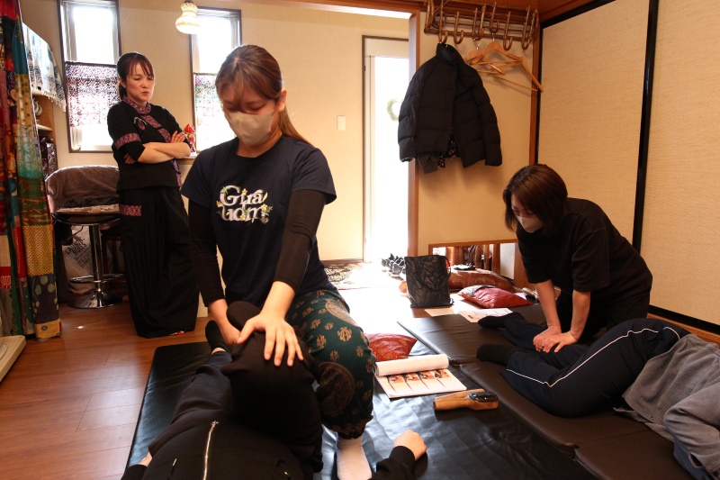 先生のデモンストレーションの後は、生徒さんの練習台としてマッサージを受けました。先生はすぐ側で見守り、生徒さんの木槌の当て方や足の位置、力の入れ方などの一つひとつに細かくアドバイスをされていました。